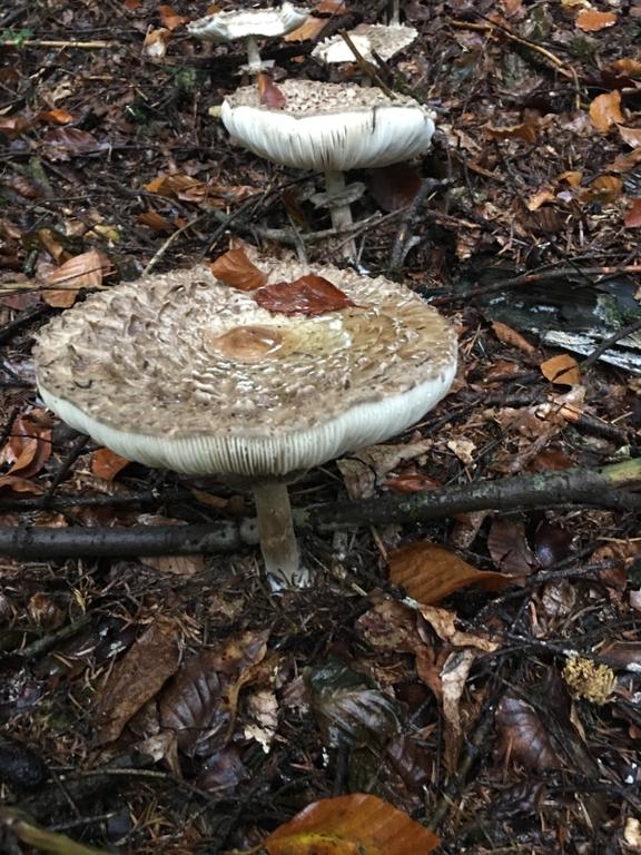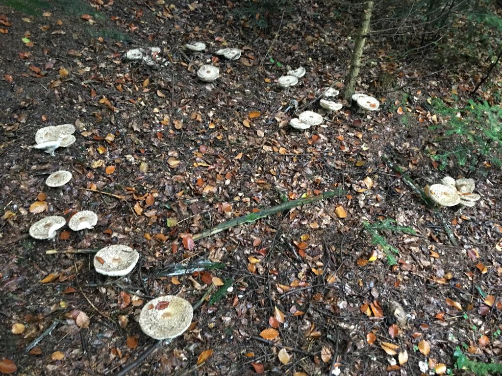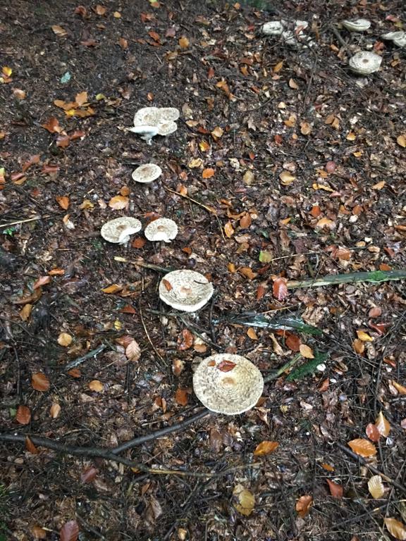 Safranschirmling, Macrolepiota rhacodes (Chlorophyllum rachodes) und nichts anderes!! M. rickenii gleicht einem kleinen Parasol und hat einen genatterten Stiel. Auch die Hutschuppung stimmt nicht für M. rickenii!