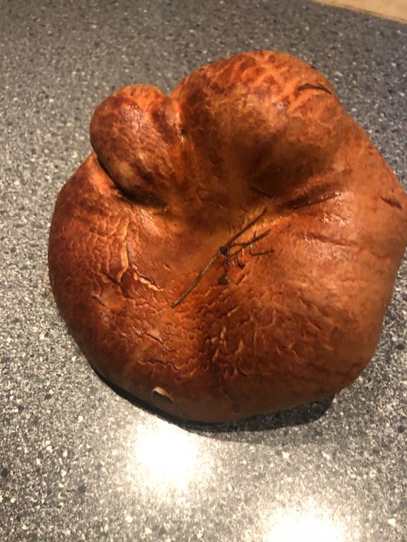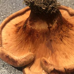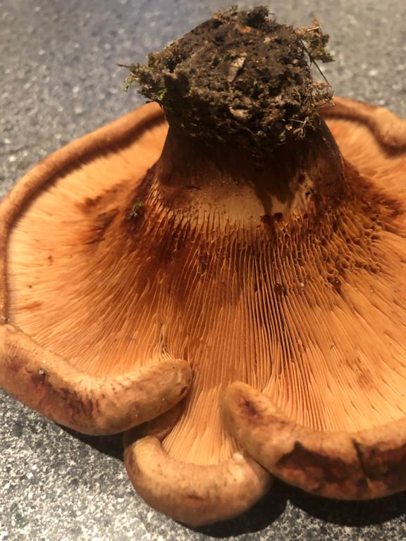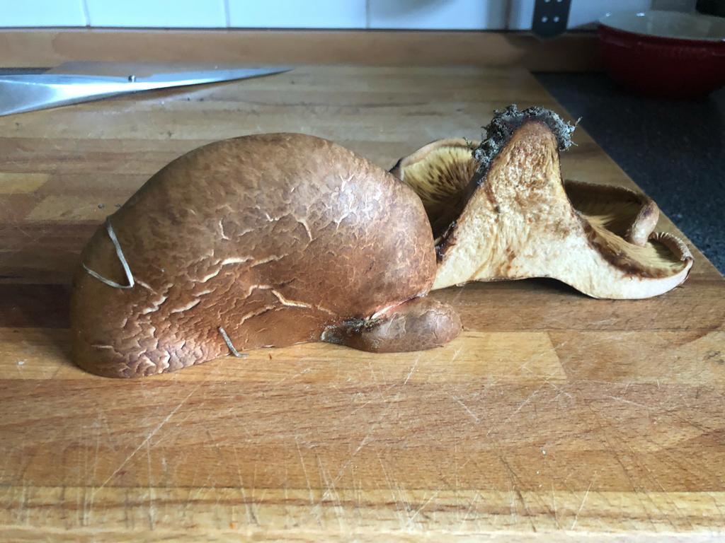 Ihr müsstet Euch mal entscheiden, wie Ihr den Pilz nennt. Einige Anfragen zuvor habt Ihr ihn als Kahlen Krempling angesprochen. Es sind teils die selben Fotos! Es ist nicht der Samtfußkrempling, sondern eine große Form des Kahlen Kremplings, Paxillus involutus! Der kurze Stiel hat sich durch die Berührung dunkel verfärbt. Die Farben sind auf einigen Bildern allerdings verfälscht.