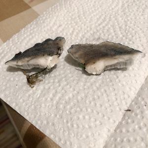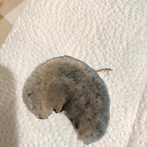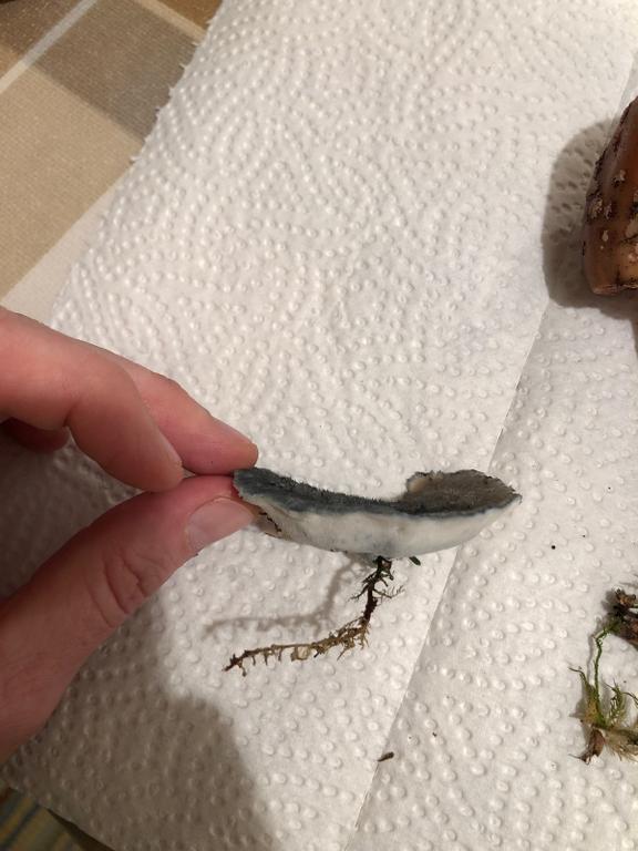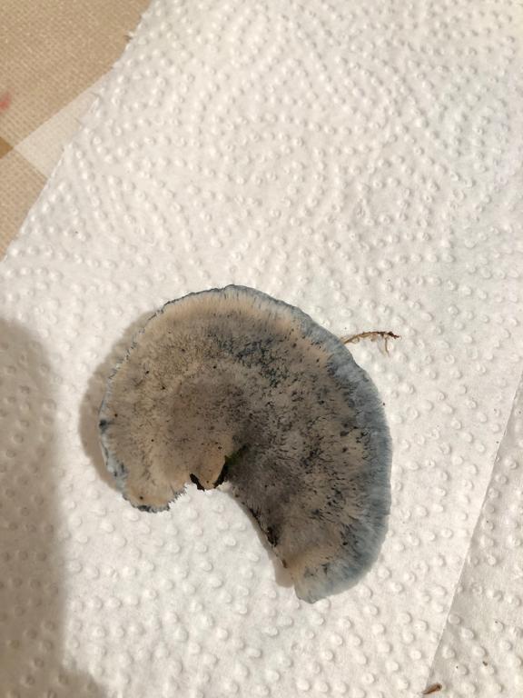 Er hat einen deutlich bläulichen Rand. Auf Druck wird er schwach grau-blau. Für einen Holzpilz ist er gar nicht mal sonderlich zäh. Leider weiß ich nicht, was für ein Baum das was, auf dessen Stumpf er wuchs. Ich fand diesen Pilz auf jeden Fall sehr interessant! Danke für eure Erläuterungen!