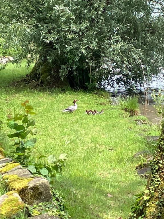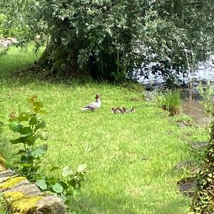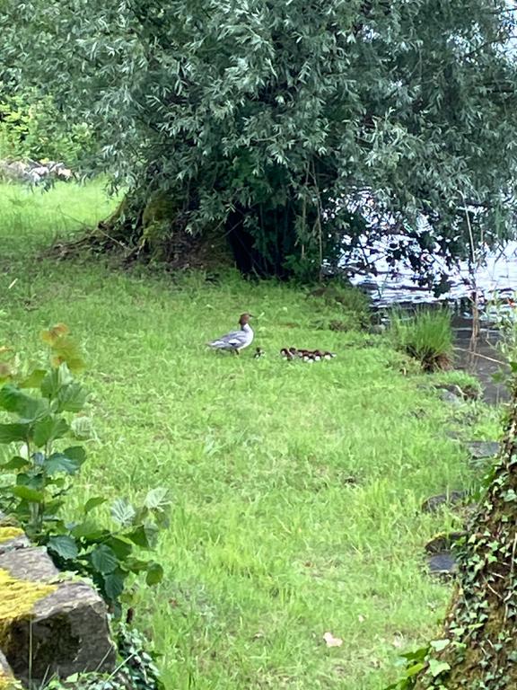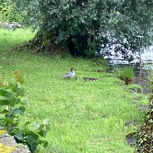 Ein Haubentaucher mit Jungen