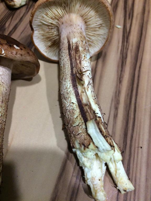 Wir benötigen für eine Bestimmung von Ritterlingen die Angabe, unter welcher Baumart der Pilz wuchs! Der flockige Stiel spricht nicht für T. ustale. Falls Standort unter Birke: Gelbblättriger Ritterling, Tricholoma fulvum.