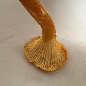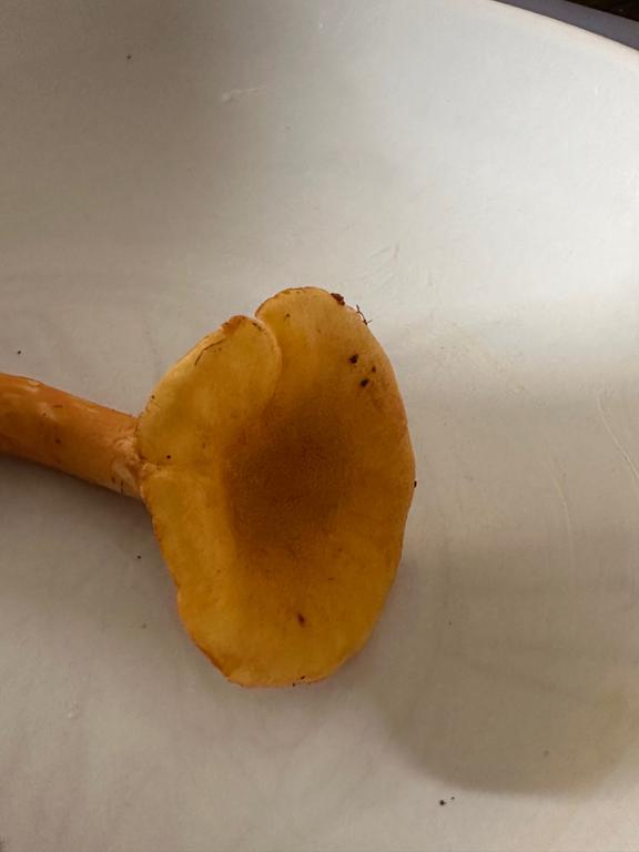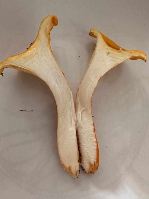 Ist das der falsche Pfifferling? Fruchtfleisch ist zwar schön weiss. Wuchs jedoch im Moos auf einem Baumstumpf.