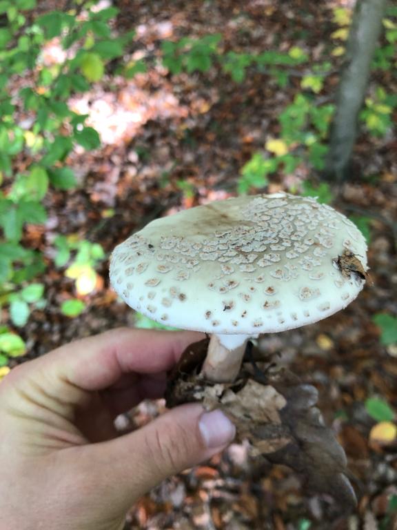 Das sieht nach einem farblich untypischen Perlpilz, Amanita rubescens, aus. Übrigens: die Hutflocken sind bei Amanita nie fest mit der Huthaut verwachsen! Bitte mal den Geruch prüfen. Der abgebildete dürfte neutral und nicht nach "Kartoffelkeller" riechen.