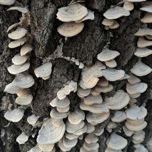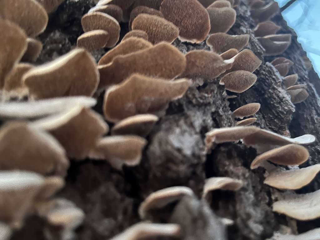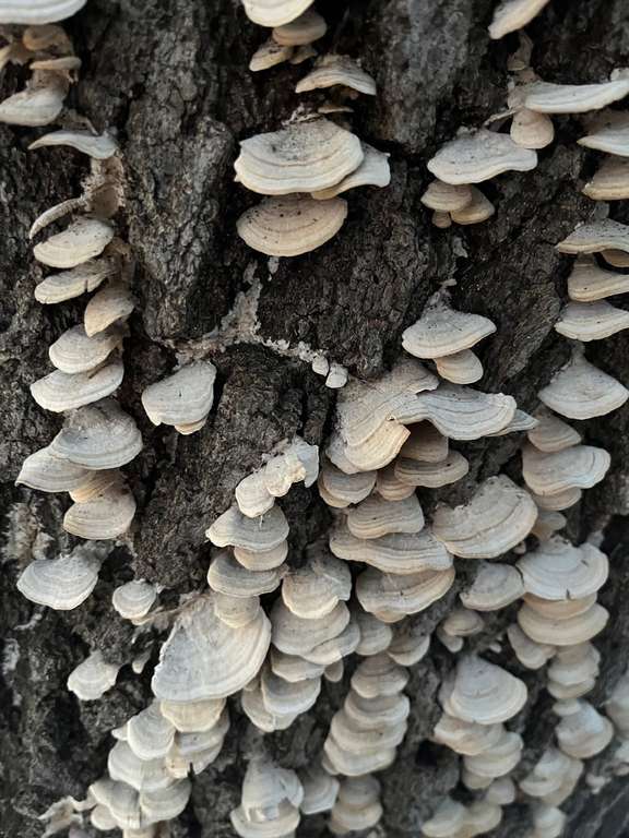 Could this be Trichaptum biforme? I don’t see any purple, but these appear to have been growing on the dead-but-upright, apparently hardwood tree, in the dead of winter. The more common T. abietinum, while a better match for the color seen here, apparently only grows on conifer trees.