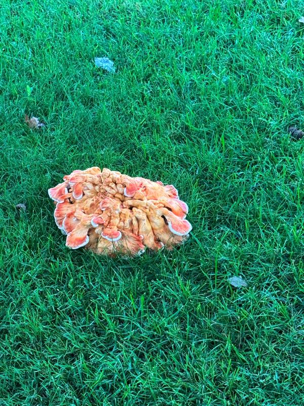 Chicken in the woods grows off of wood. Might be a lobster mushroom.