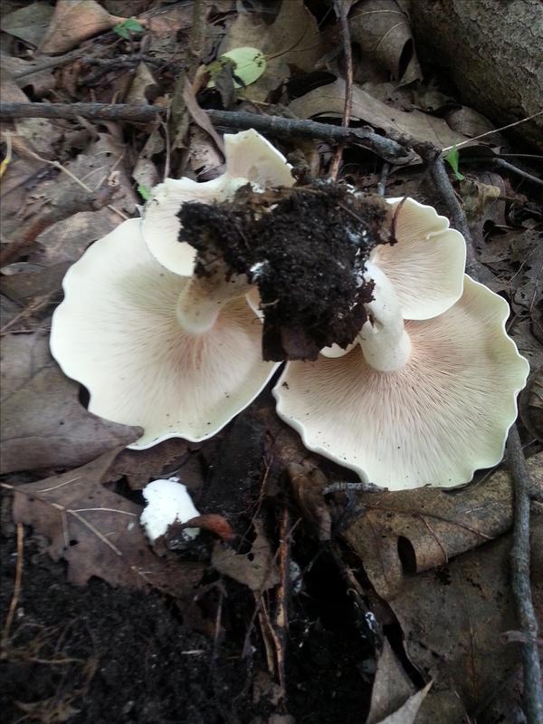Groups scattered on soil. Cream colored spore print. Dry white cap.