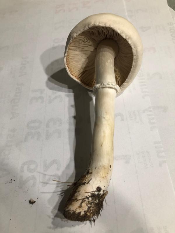 Könnte ein alter Wiesenchampignon sein. Man müsste mehrere Alterszustände und aufgeschnitte Pilze
