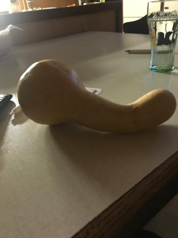 Gooseneck squash/gourd, edible. Best to slice it and dip in an egg wash and dip in bread crumbs and deep fried.