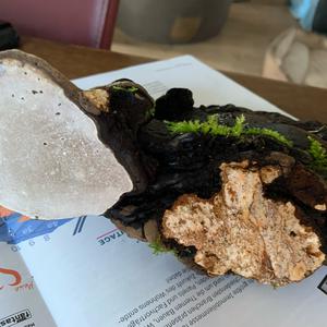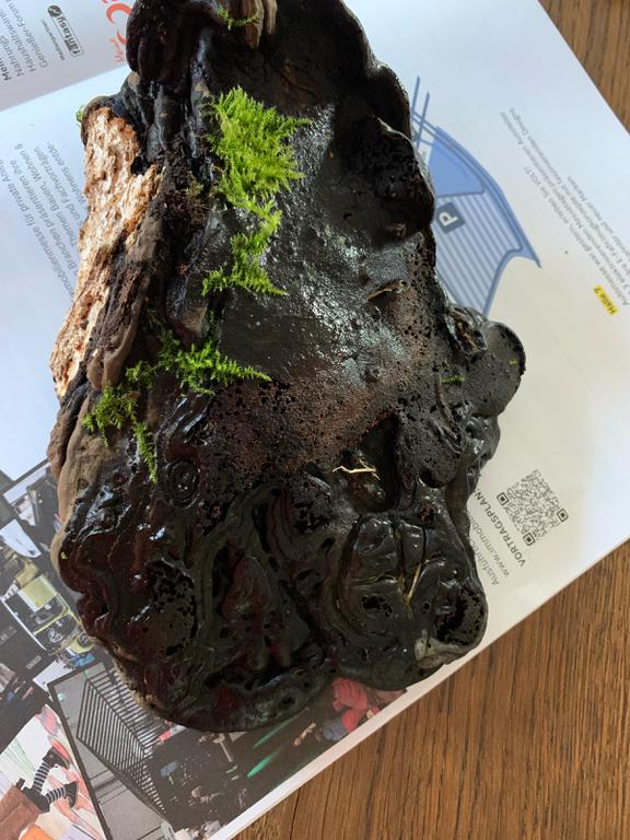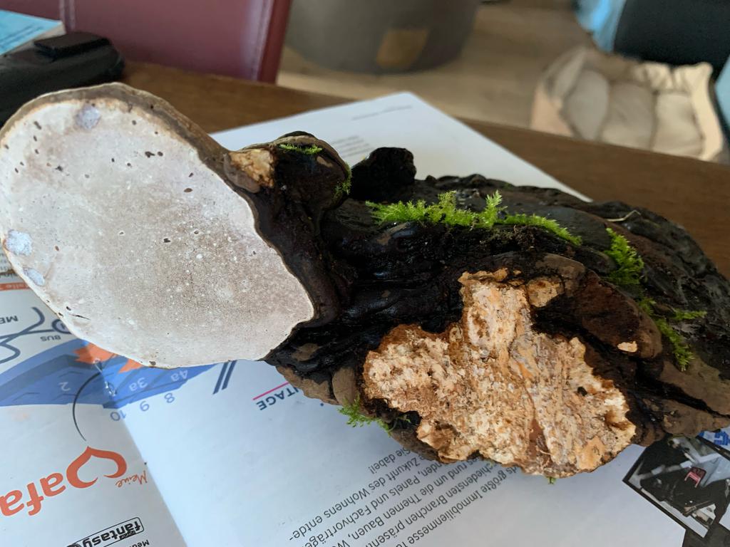Er ist auf einem morschen Baumstamm gewachsen den ich nicht bestimmen konnte. Unten sind es Poren in hellgrau