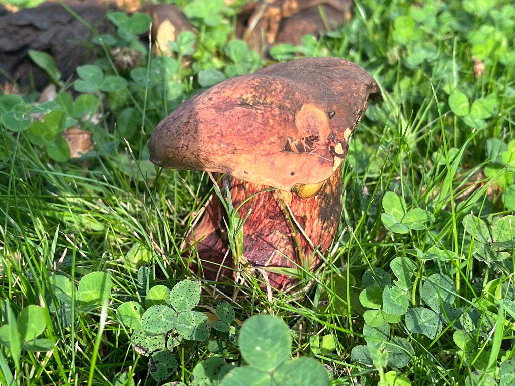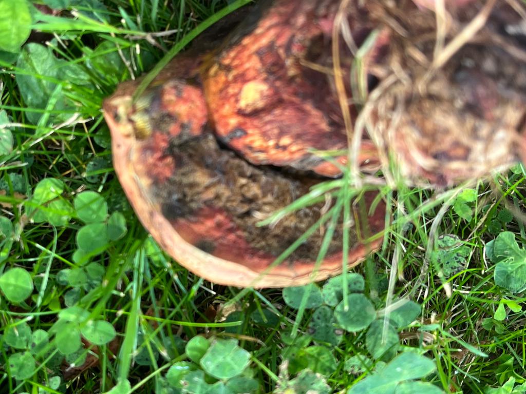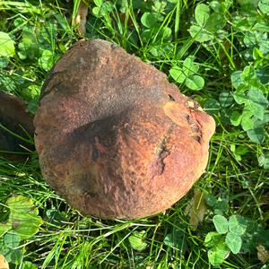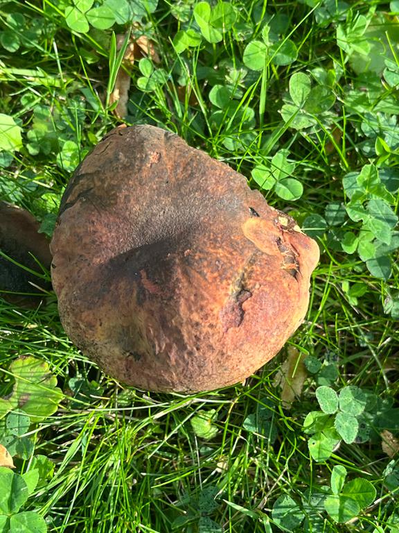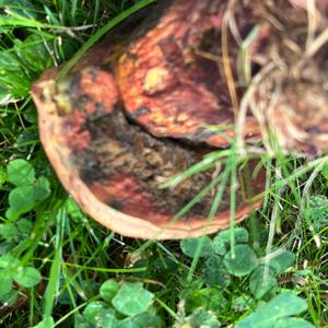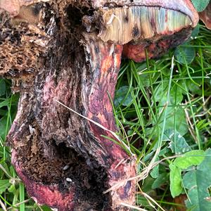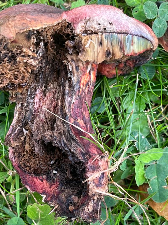 Old rotted specimen but you can see some slight bluing on the torn cap where the pores are freshly exposed.