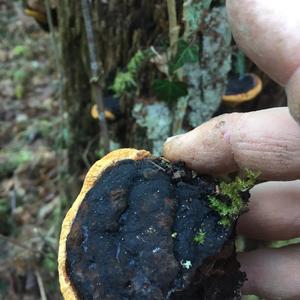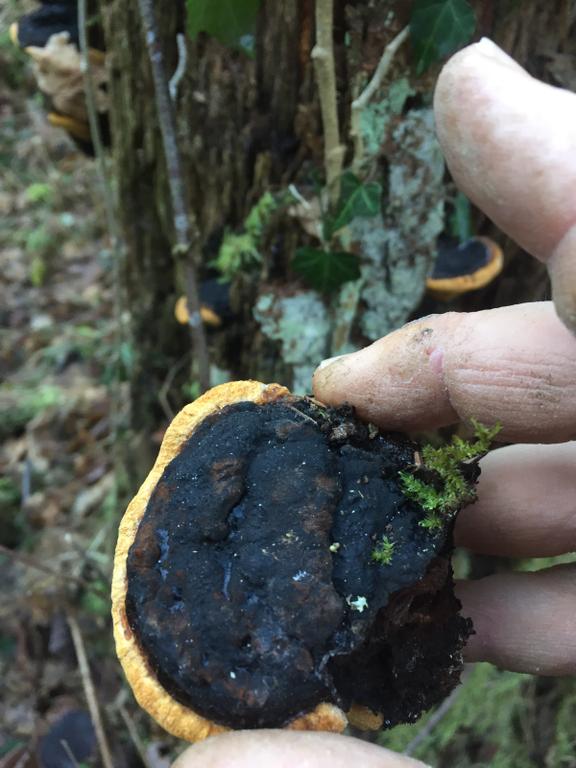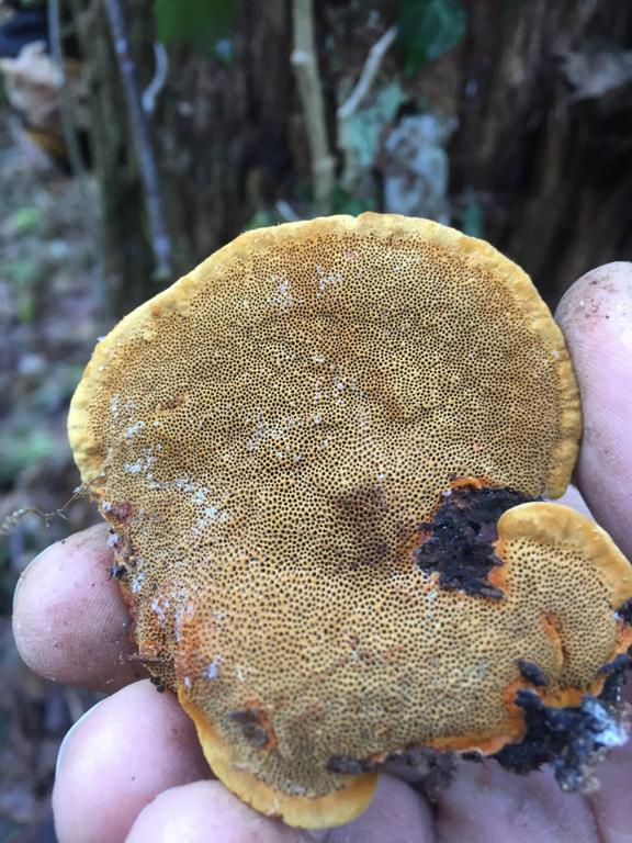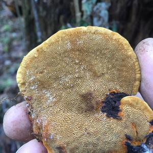 Das kann niemals der Fichtenporling sein! Falls Geruch auffällig Fenchel- oder anisartig: Fenchelporling, Gloeophyllum odoratum. Es wäre schön, wenn das Ursprungsland angegeben würde, evtl. auch das Substrat!