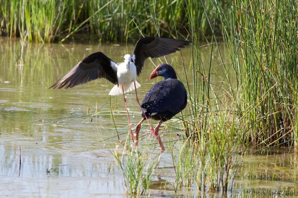 Stelzenläufer(Himantopus himantopus) attakiert Purpurhuhn(Porphyrio porphyrio)