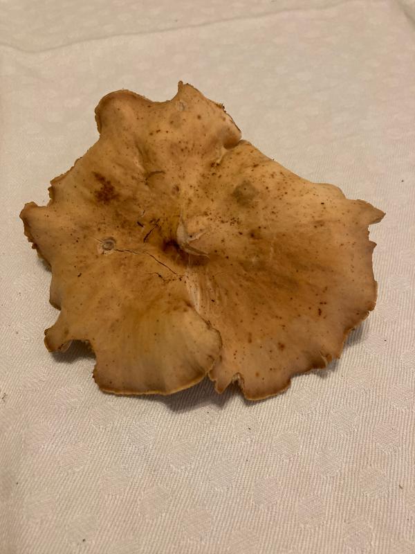 Hut mit gewelltem Rand, ca. 15 cm, Lamellenpilz, Lamellen parallel - am Stiel ansetzend - von der Mitte nach außen an Höhe verlierend, keine Milchbildung bei Verletzung