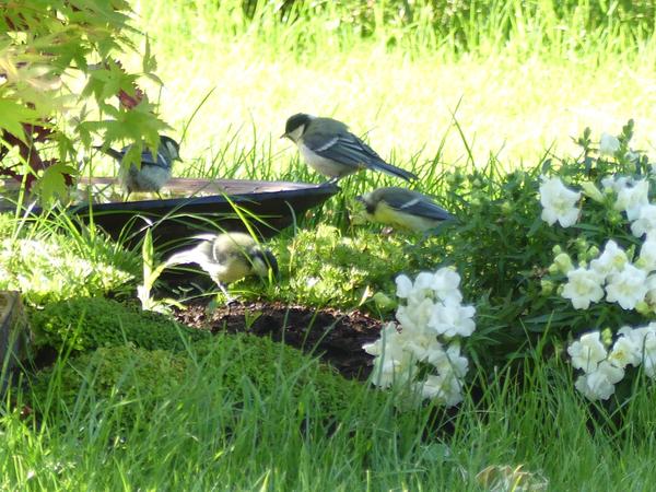 4 oisillons Mésanges charbonnières venant s'alimenter et boire