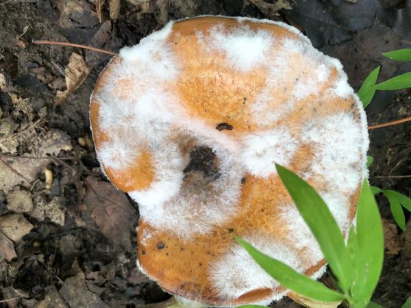 Laccaria thyinos with a growth of fuzz on it. 10 others had the same growth