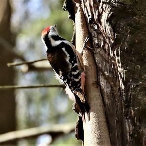 It is distinguishable from all other European spotted woodpeckers by its missing black lore stripe. It is also the only one that is characterized by the very weak difference in coloring between the sexes.