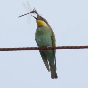 A colorful bird. The belly and breast area is turquoise-colored. The crown, nape and backare rust-brown colored. The wings also bear both colors. A black eye streak is located above the yellowish chin. It has a slightly curved, long beak.